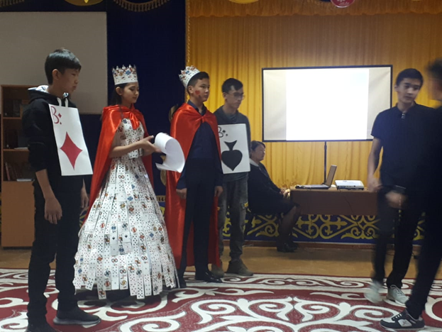 9«А» сыныбы – «Кітап» патшалығы, 9«Ә» сыныбы – «Құстар» патшалығы, 9 «Б» сыныбы – «Аспан» патшылығы, 9 «В» сыныбы – «Су» патшалығы, 10«А» сыныбы – «Қуаршақтар» патшалығы, 10 «Ә» сыныбы – «Кино» патшалығы, 10«Б» сыныбы – «Карта» патшалығы, 10 «В» сыныбы – «Шахмат» патшалығы тақырыптарын қорғап шықты. Нәтижесінде 10 «Б» сыныбы «Карта» патшалығы бас жүлдеге ие болды.