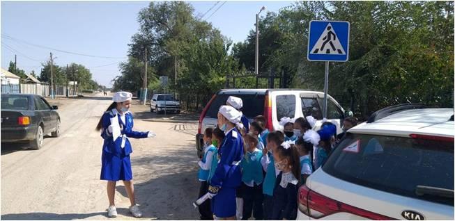 Намазбай Ақшабаев атындағы орта мектебінде жоспарға сәйкес 2021 жылдың 1-9 қыркүйек аралығында "Абайлаңыз балалар!" жедел-профилактикалық іс шарасы аясында "Мектепке барар қауіпсіз жол!" тақырыбында мектебіміздің "Жас инспекторлар" тобы түсіндіру жұмыстарын жүргізді.