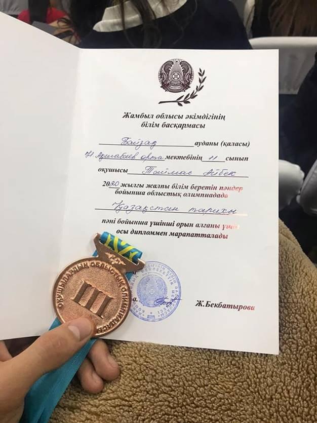 10 январь 2020 0 1 2 3 4 5 2020 жылғы жалпы білім пəндер бойынша облыстық олимпиадасы өткізілді. 2020 жылғы жалпы білім пəндер бойынша облыстық олимпиадада Қазақстан тарихы пəнінен Намазбай Ақшабаев атындағы орта мектебінің 11 сынып оқушысы Таймас Айбек үшінші орынмен марапатталды.